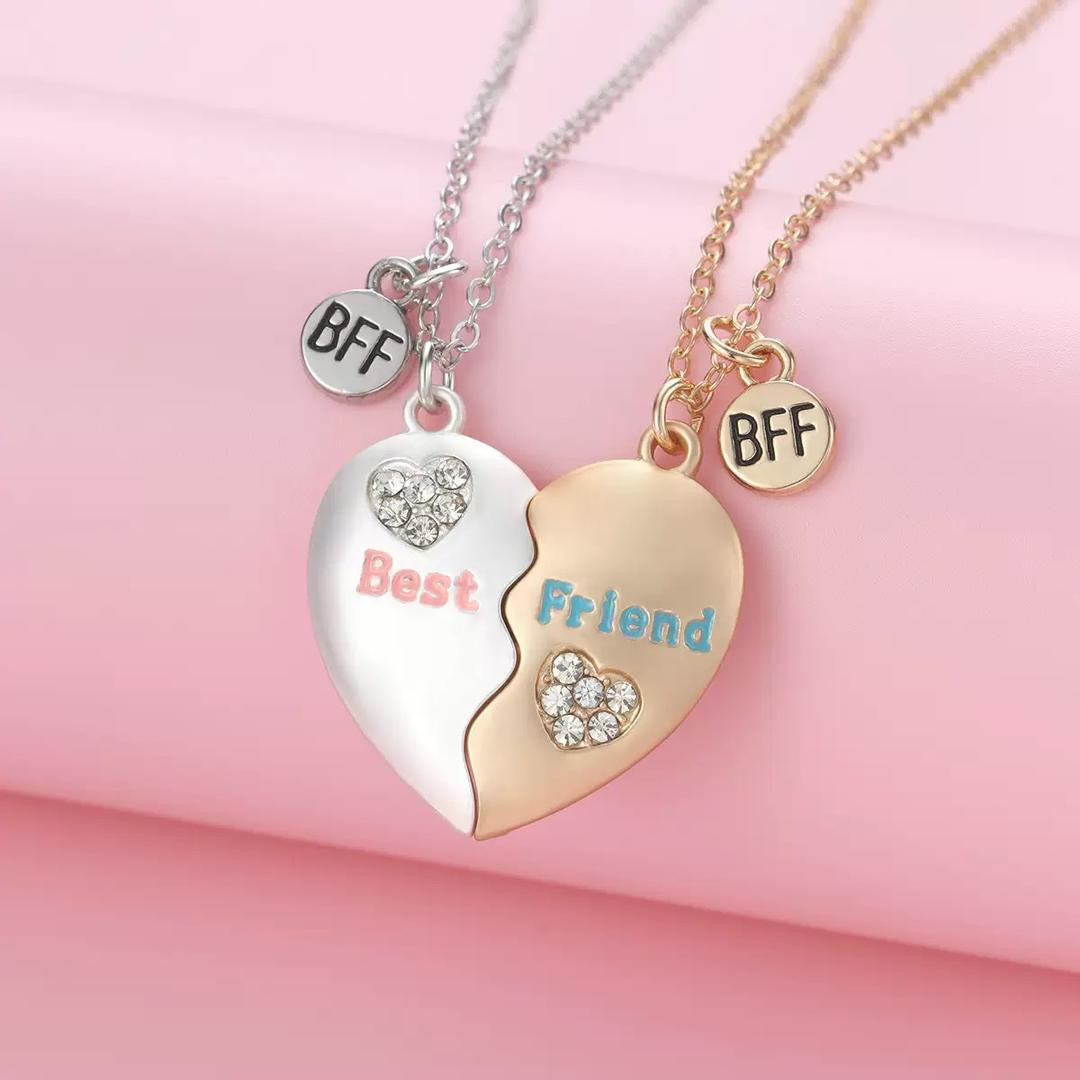 Capture the magic of best friendship with the Belachica Magnetic BFF Heart Necklace Set, designed for those inseparable duos who want to wear their bond close to their hearts. This stylish pair includes two necklaces: one with a sleek silver-tone chain and the left half of a sparkling heart pendant engraved with "Best" in pretty pink, the other featuring a warm gold-tone chain with the right half saying "Friend" in vibrant blue—complete with dazzling rhinestone accents that catch every light.