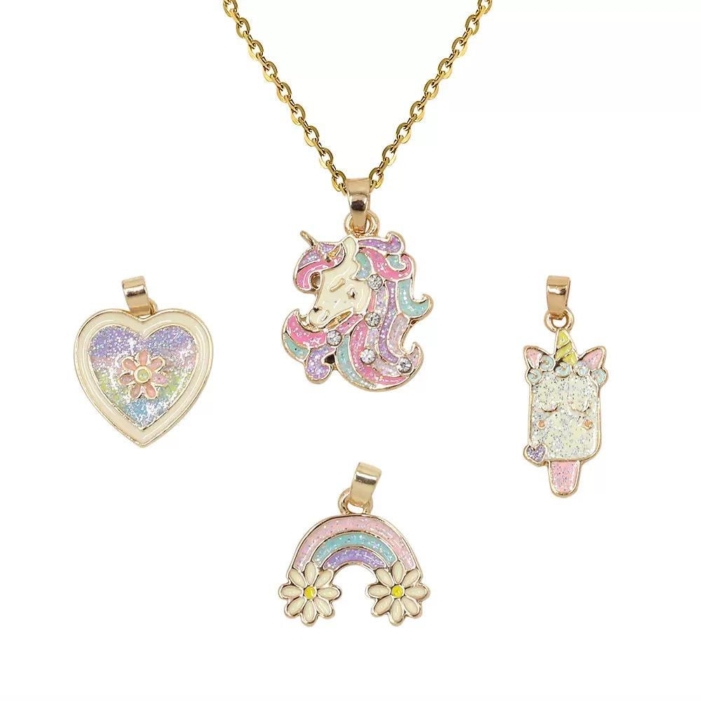Each pendant shines with shimmering glitter details and is finished in warm gold tones, perfect for mixing and matching to suit your mood or outfit. The set comes with a dainty gold-tone chain, making it an adorable gift for little fashionistas or anyone who loves enchanting accessories.